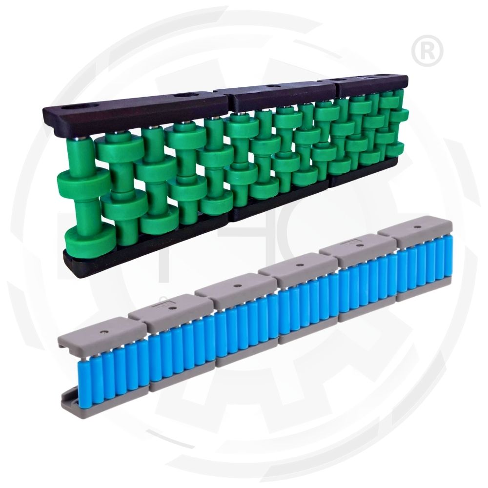 Estos componentes garantizan la transmisión eficiente de potencia y el guiado preciso en cadenas de tablillas, rectas; curvas y más.